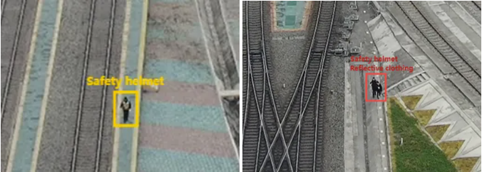 成都北編組站為半封閉場(chǎng)站,外來(lái)人員管控難度較大,通常需要安防人員發(fā)現(xiàn)入侵后立即趕往監(jiān)測(cè)點(diǎn)對(duì)其進(jìn)行驅(qū)離。鐵路編組站無(wú)人機(jī)智能巡檢平臺(tái)可在編組站區(qū)域設(shè)定周期巡視航線任務(wù),無(wú)需人員操控,無(wú)人機(jī)不受白天黑夜限制按周期任務(wù)進(jìn)行自動(dòng)巡視,通過(guò)對(duì)人員的服裝、頭飾進(jìn)行AI識(shí)別,對(duì)外來(lái)人員以及未正確佩戴安全帽、反光服的工作人員進(jìn)行抓拍記錄并通過(guò)喊話照明一體機(jī)進(jìn)行報(bào)警驅(qū)離、安全提示。另外,巡檢系統(tǒng)對(duì)工務(wù)和電務(wù)場(chǎng)站內(nèi)的重要檢修作業(yè)提供安全防護(hù),無(wú)人機(jī)可指定飛行至作業(yè)區(qū)域,對(duì)全過(guò)程進(jìn)行跟蹤監(jiān)控,實(shí)現(xiàn)全站場(chǎng)各專業(yè)間的安全互保互助。