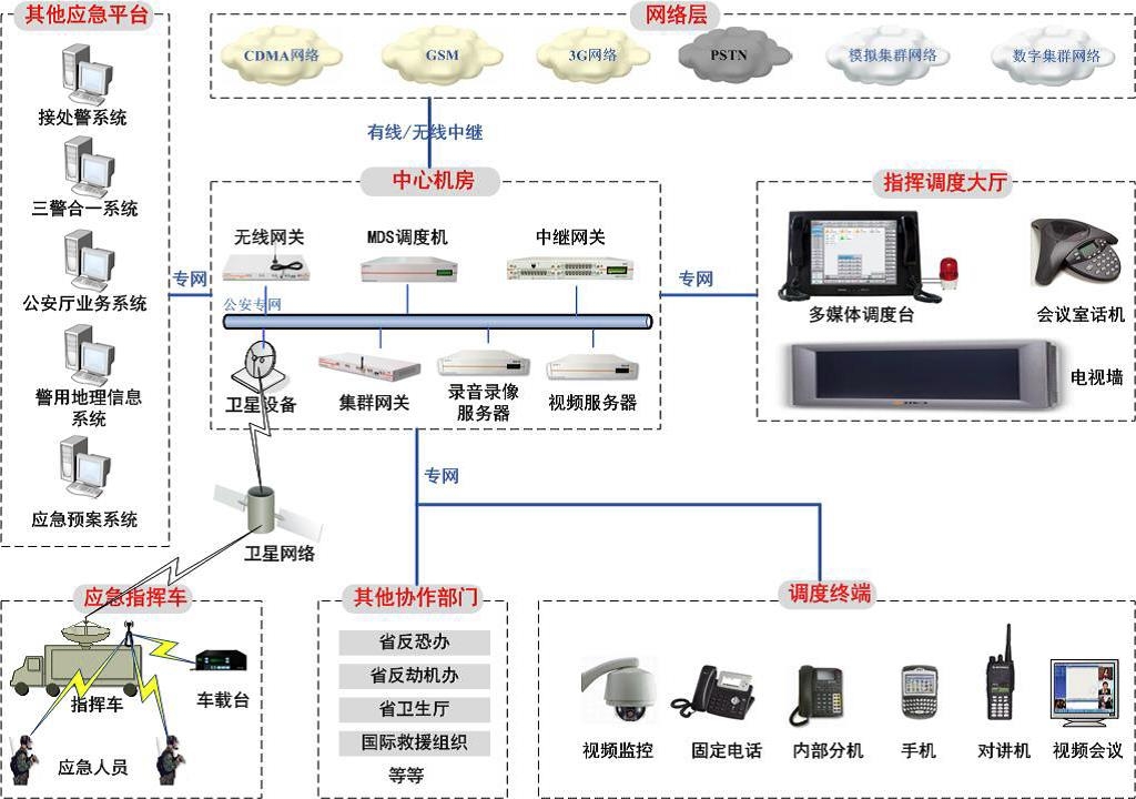 系統(tǒng)主要集成了軟交換技術(shù)、呼叫中心技術(shù)、多媒體調(diào)度、廣播技術(shù)、監(jiān)控技術(shù)、視頻會議技術(shù)、視頻監(jiān)控技術(shù)、無線圖像傳輸技術(shù)、計算機應(yīng)用技術(shù)、無線集群通信技術(shù)、衛(wèi)星通信技術(shù)等。主要核心技術(shù)和創(chuàng)新是將有線通信系統(tǒng)、移動通信系統(tǒng)、公安電話通信系統(tǒng)、公安視頻會議系統(tǒng)、視頻監(jiān)控通信系統(tǒng)、無線集群通信系統(tǒng)與多媒體指揮調(diào)度系統(tǒng)進行聯(lián)網(wǎng),實現(xiàn)多網(wǎng)融合,統(tǒng)一調(diào)度,并通過專網(wǎng)實現(xiàn)與市政府的其他系統(tǒng)互聯(lián),保證該系統(tǒng)在任何時間、任何地點、任何天氣情況下都可采用現(xiàn)有的任何終端實現(xiàn)語音通信,并便于市政府領(lǐng)導(dǎo)在出現(xiàn)緊急狀況時可通過任何終端實現(xiàn)緊急調(diào)度工作;在特殊場所,可安裝視頻監(jiān)控探頭,調(diào)度中心平時可通過調(diào)度系統(tǒng)監(jiān)控遠端現(xiàn)場,一旦發(fā)現(xiàn)現(xiàn)場出現(xiàn)應(yīng)急事件時,可在當(dāng)時視頻畫面上直接呼叫與這一路視頻圖像所捆綁的語音終端,出警人員可快速到達現(xiàn)場,對應(yīng)急事件實時相應(yīng)處置。