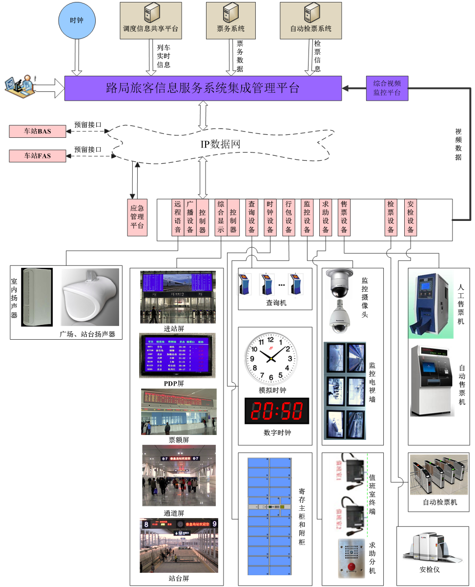 系統(tǒng)設(shè)置集成管理平臺、綜合顯示、監(jiān)控、廣播、時鐘、查詢、求助和安全檢查等子系統(tǒng)。通過集中組織管理列車服務(wù)信息(包括列車計劃、列車動態(tài))、生產(chǎn)運(yùn)營管理信息等,根據(jù)列車信息等統(tǒng)一指揮、調(diào)度及管理各個子系統(tǒng)的運(yùn)行。各子系統(tǒng)之間的信息交流和共享均通過旅客服務(wù)系統(tǒng)統(tǒng)一完成。按運(yùn)營需要制作業(yè)務(wù)模版,根據(jù)列車到發(fā)、檢票等相關(guān)業(yè)務(wù)信息,自動生成廣播計劃和綜合顯示計劃,實(shí)現(xiàn)綜合業(yè)務(wù)操作。并對各子系統(tǒng)設(shè)備進(jìn)行集中監(jiān)控和報警管理。