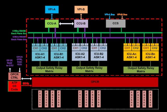 LFCT系統(tǒng)接收來自聯(lián)鎖計算機(jī)的指令,向FS2500型軌道電路發(fā)出預(yù)先定義的軌道編碼信息。LFCT系統(tǒng)由CCU(中心控制單元)、ICU(接口控制單元)、CCS(中心監(jiān)控單元)、背板、結(jié)構(gòu)件等構(gòu)成。