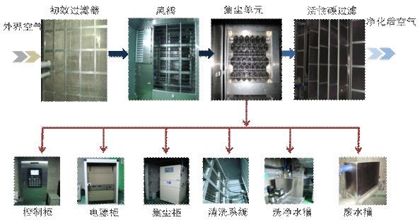 電氣集塵空氣凈化系統(tǒng)主要由初效過濾單元、電氣集塵單元、清洗系統(tǒng)、控制柜、電源柜、集塵柜等組成。