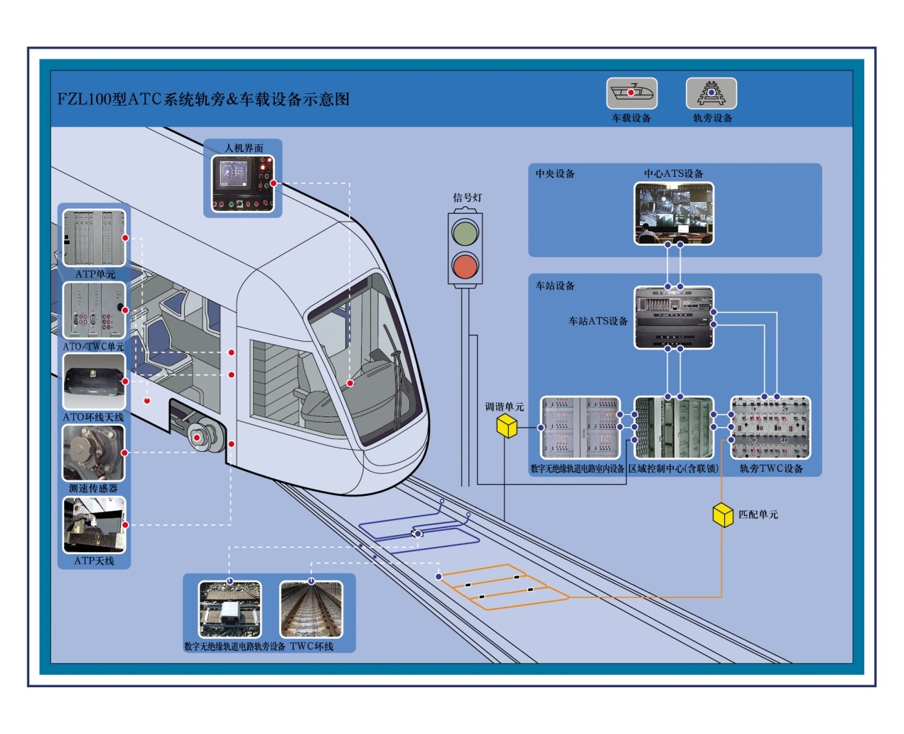 FZL100型ATC系統(tǒng)由ATS、區(qū)域控制中心、數(shù)字軌道電路、車地通信twc、車載atp/ato設備構(gòu)成,其中區(qū)域控制中心采用聯(lián)鎖和軌旁atp一體化設備。