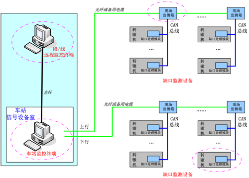 JQ型轉轍機缺口監(jiān)測系統(tǒng)由車站監(jiān)控終端、現場監(jiān)測箱和缺口采集處理模塊組成,同時,根據現場需求,系統(tǒng)還可擴展遠程監(jiān)控終端,其結構如下圖所示。