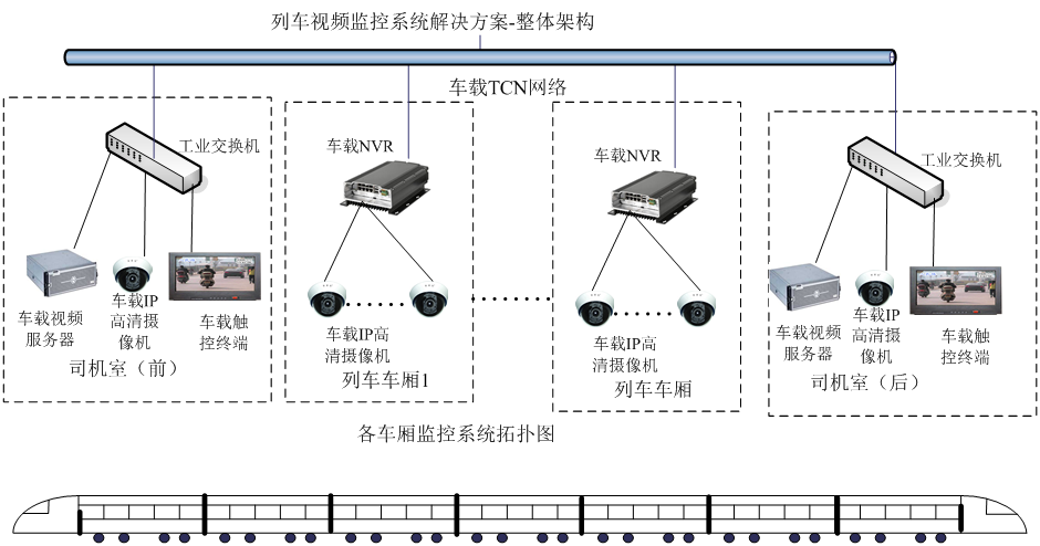 智能列車視頻監(jiān)控系統(tǒng)主要包括:車載高清網(wǎng)絡(luò)攝像機(jī)(簡稱車載高清ipc)、車載網(wǎng)絡(luò)硬盤錄像機(jī)(簡稱車載NVR)、車載監(jiān)視器、車載網(wǎng)絡(luò)交換機(jī)、車載監(jiān)控客戶端軟件、車載監(jiān)控系統(tǒng)管理軟件等。